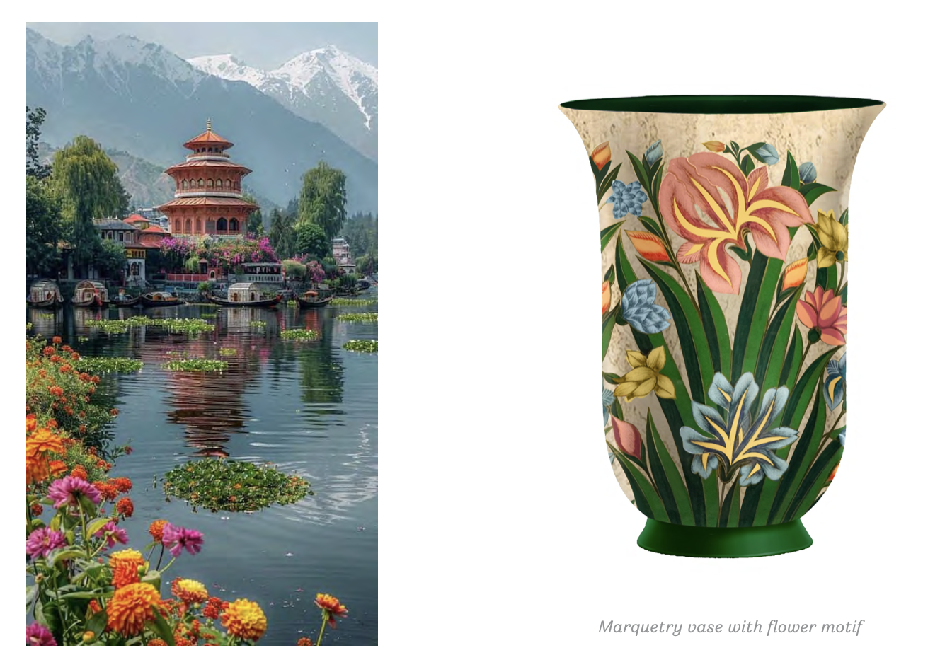 In collaboration with local artisans, the collection highlights the refinement of Kashmiri craftsmanship, from delicate wood carvings, papier-mâché, to hand-embroidered patterns that echo the elegance of traditional shawls and rugs.